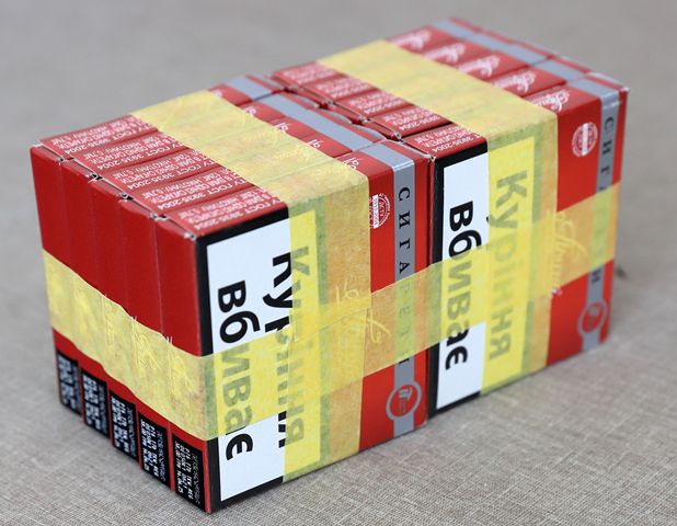 Сформирована в блоки по 10 пачек - связанная бумажным скотчем.