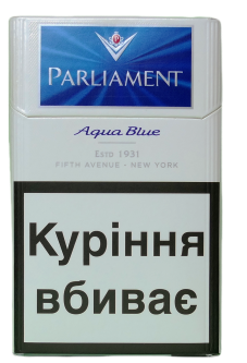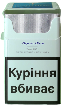 Как и многие другие производители табачных изделий так и «Филип Моррис Украина» выбрала материал для своей продукции, в этом случае сигареты Parliament Aqua Blue  - картон. Хотелось бы подчеркнуть оригинальность оформления пачки сигарет Parliament. Она заключается в том, что на крышке пачки, на переливающемся синим фоне набиты логотип и названия бренда.